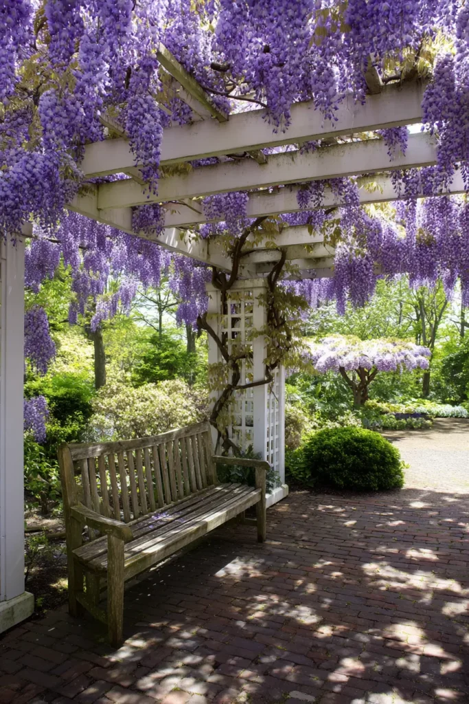 The reason I’m so obsessed with this look is the sheer drama and romance of the wisteria completely taking over the structure. The stark white of the painted wood provides the perfect, crisp frame for those unbelievably gorgeous lavender blossoms, giving it a sophisticated, old-world vibe. It truly transforms a simple outdoor area into an unforgettable destination, proving that when you let nature do its thing on a classic design, the result is pure magic.