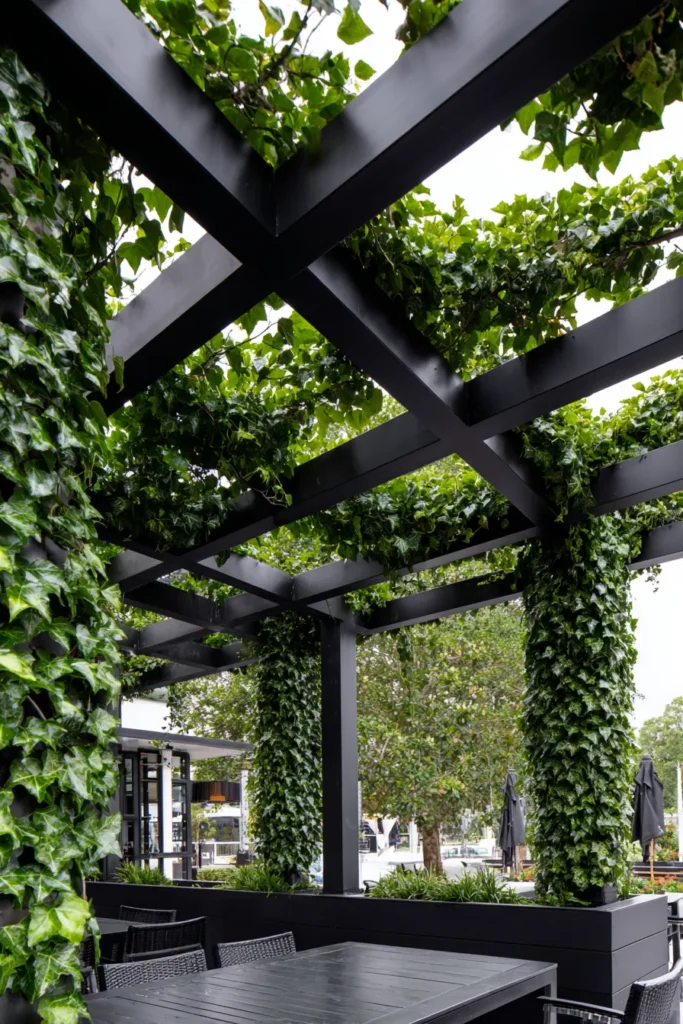 This design features a bold, modern pergola crafted from sleek black metal, creating a striking contrast with the lush greenery. The structure is characterized by its strong, clean lines and a grid-like roof that allows plenty of natural light to filter through the leafy canopy. English ivy is the star here, completely enveloping the thick support columns and trailing beautifully across the crossbeams, creating a sense of a secret garden that’s both chic and architectural. The deep black color of the metal complements the rich, dark green of the vines, making for an incredibly sophisticated outdoor dining area, perfect for entertaining or just enjoying a quiet afternoon.