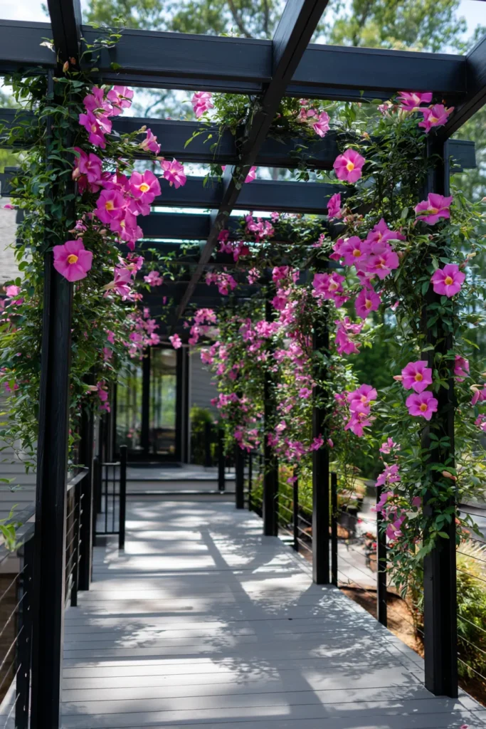 This is such a gorgeous take on a modern pergola transforming a simple walkway into an absolutely stunning floral tunnel. It features sleek, thin black metal beams creating a graceful overhead structure that perfectly complements the contemporary gray siding of the house. The real magic comes from the vibrant hot pink flowers likely Mandevilla or a similar climbing vine which completely drape the sides and the top. The contrast of the saturated pink blooms against the dark metal and the pale gray decking creates a sophisticated yet unbelievably cheerful entrance, guiding visitors right to the door.