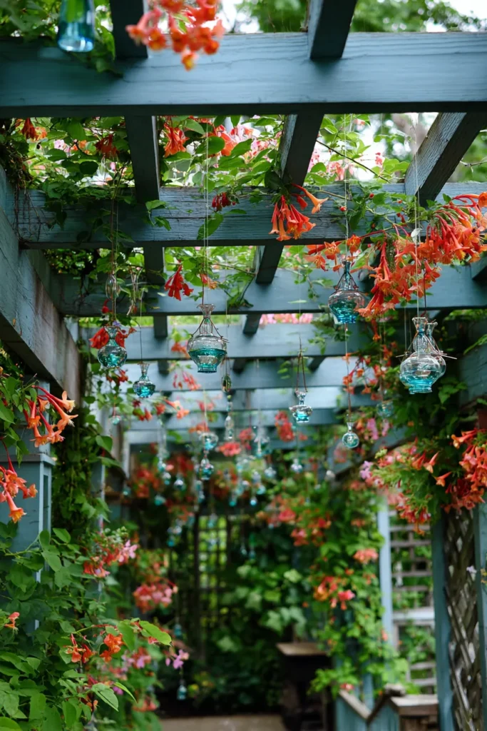 This enchanting wooden pergola has such a lovely, weathered charm painted in a beautiful shade of muted blue or perhaps a greenish-blue giving it an aged, cottagecore feel. The structure itself is robust with evenly spaced beams, providing ample support for climbing vines. It’s absolutely bursting with vibrant orange trumpet vines or similar blossoms that add an incredible burst of warm color against the cool blue. What truly makes this design magical are the numerous hanging glass baubles in varying shades of blue, like little dewdrop jewels suspended from the rafters, catching the light and creating a whimsical, fairytale atmosphere.