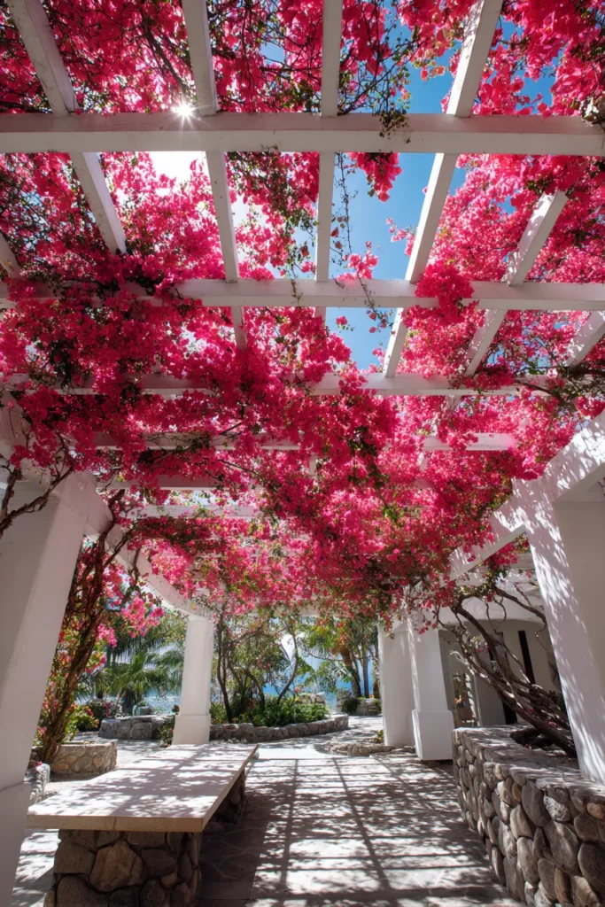 Talk about a showstopper! This brilliant white pergola offers a classic, coastal-inspired structure with thick, clean pillars and a simple, yet sturdy, horizontal lattice roof. The stark white paint perfectly reflects the bright sunshine and feels instantly resort-ready, especially with the gorgeous stone seating area right beneath. The entire roof is completely smothered in shocking pink Bougainvillea vines, creating a dense, breathtaking canopy that filters the sunlight into dappled shade and casts intricate patterns on the ground. This combination of crisp white architecture and overflowing color is a staple of Mediterranean and tropical luxury.