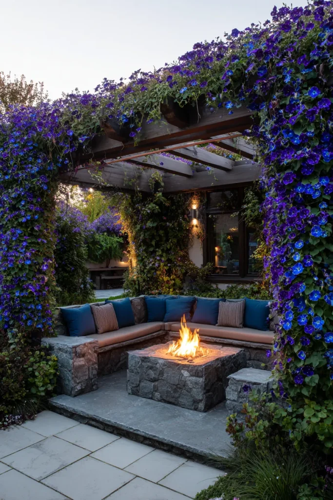 I am absolutely in love with how magical and cozy this entire setup looks, especially when that fire is lit and the string lights are twinkling. That intense color of the purple flowers is just breathtaking, giving the whole space a romantic, slightly moody vibe that feels so different from the usual bright green and white pergolas. It’s the ultimate inspiration for creating a super chic, designated outdoor entertainment zone, proving that a pergola can be the ceiling for a whole second living space. This is definitely going on my vision board for the most perfect, enchanting spot to unwind with friends after sunset