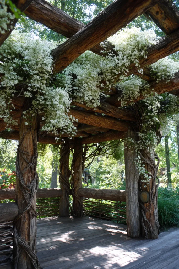 This magical pergola is truly a celebration of all things rustic and natural, looking like it grew right out of a fairytale forest. It’s constructed from thick, rough-hewn logs that are left untreated, giving the structure a wonderfully organic texture and shape. The support posts are beautifully adorned with thick, twisting woody vines that wrap around them like natural sculptures. Cascading from the roof beams is an absolute cloud of delicate white flowers, likely Clematis or perhaps Climbing Hydrangea, creating soft, billowy patches of shade and adding a stunning contrast to the rugged wood. The whole setup feels incredibly peaceful and deeply integrated into the surrounding woods.