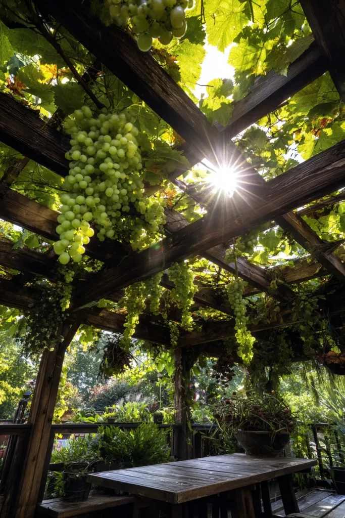 I absolutely adore this idea because it proves your outdoor decor can be both beautiful and productive—what a win-win! Imagine having friends over for lunch and literally reaching up to pick fresh grapes right off your “roof” for dessert. The way the sunlight creates those little starburst effects through the leaves and lights up the fruit is just so incredibly charming and makes the whole space feel like a little sun-drenched European hideaway. This is easily one of the most unique and rewarding pergola ideas I’ve ever seen, and it gives the entire space a wonderful sense of old-world abundance.
