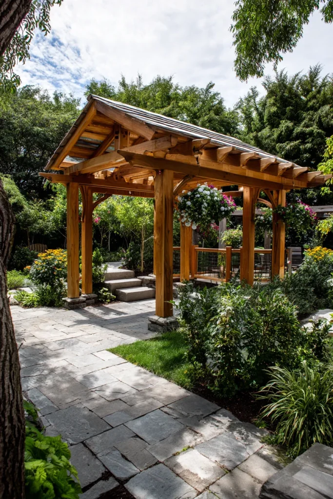 This pergola has a tall gabled roof with exposed wooden beams, giving it a timeless appeal. Surrounded by lush plants and a stone walkway, it feels like the centerpiece of the garden.