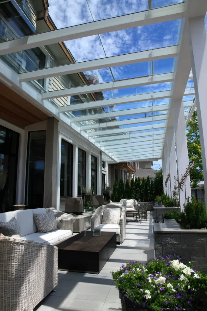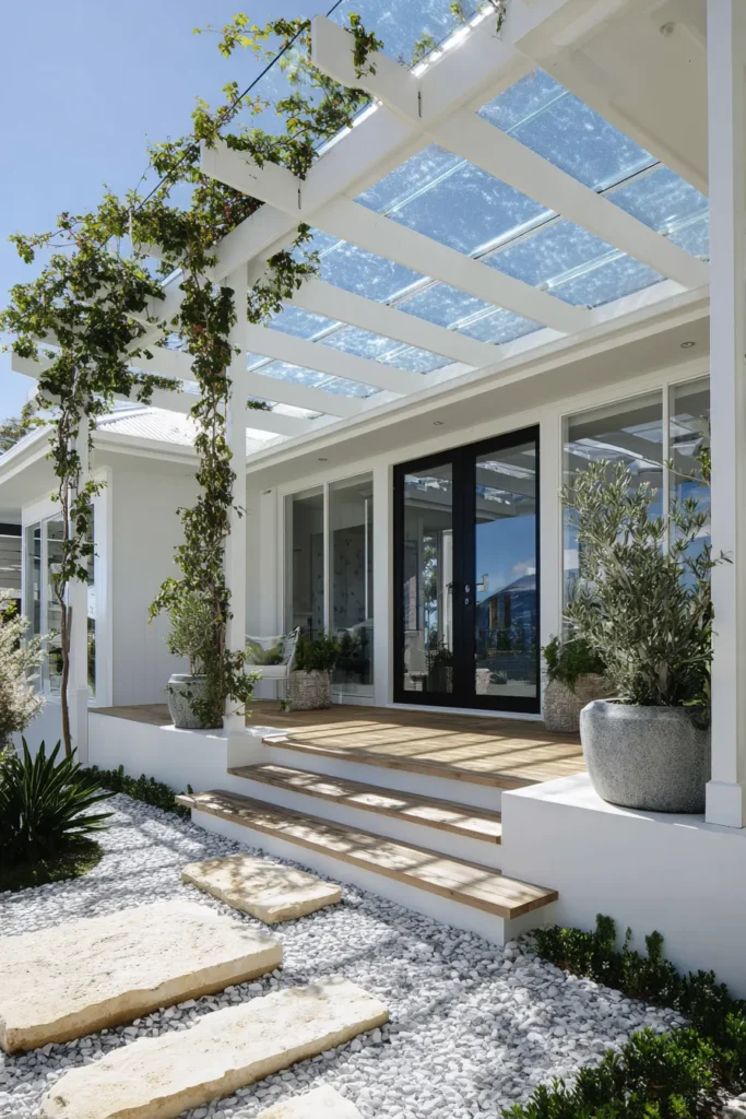 Here the pergola is topped with clear glass roof panels that let the sunlight pour through while protecting the space below. White framing keeps the look fresh and coastal, while climbing plants soften the structure with a natural charm.