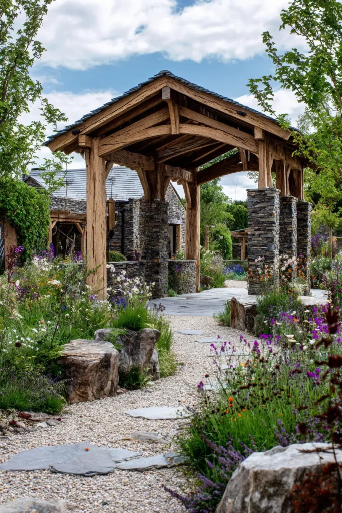 This pergola blends rustic stone columns with heavy wooden beams and a gabled roof, giving it a strong, traditional presence. Surrounded by wildflowers and a natural garden path, the space feels rooted in nature.