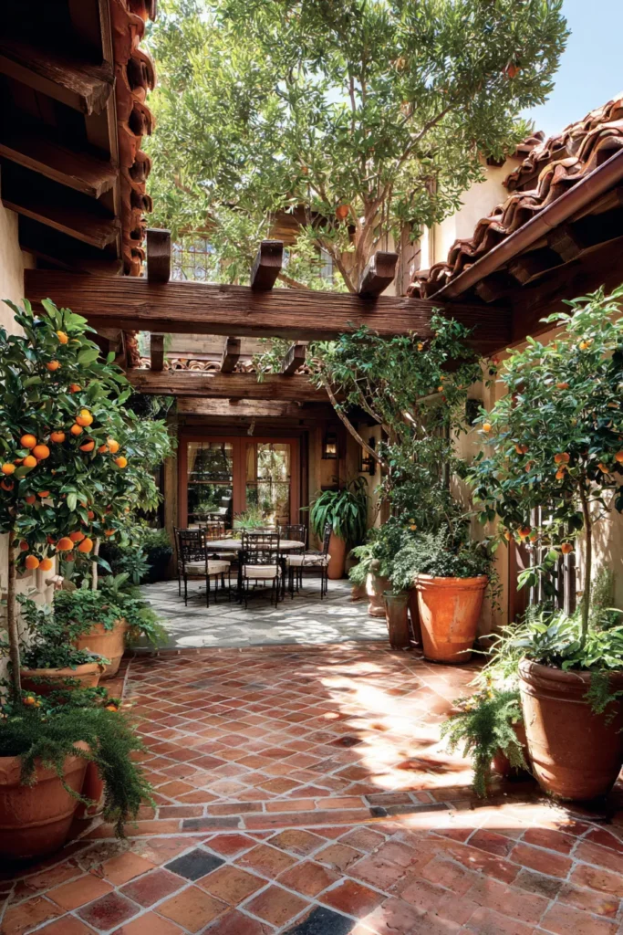 I adore how lively this space feels. The citrus trees, the earthy tiles, and the rustic beams all work together to create a space that feels warm and full of life.