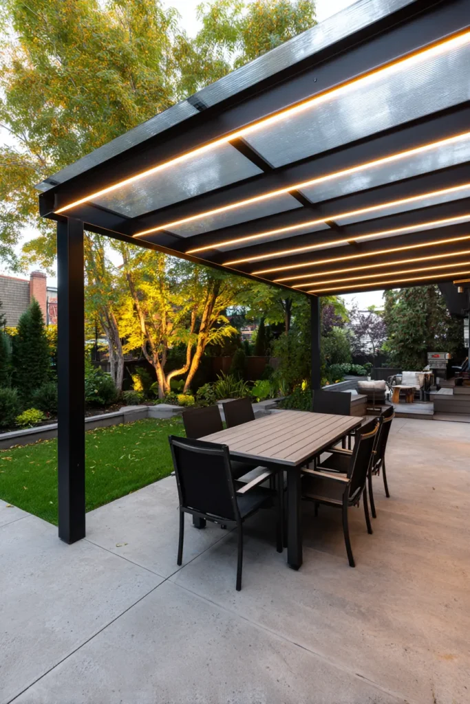 This pergola has a clean black frame topped with translucent panels and accented by sleek built-in light strips. The dining area beneath feels contemporary and ready for long evenings outside.