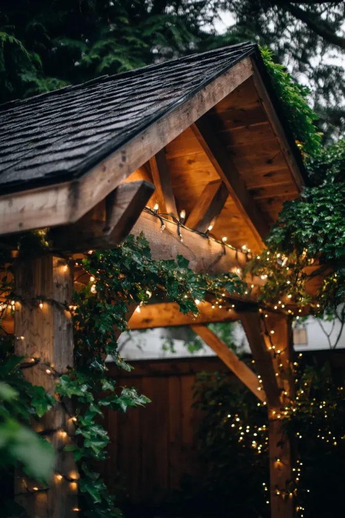 This gabled pergola is wrapped with lush climbing vines and sparkling string lights. The warm wood tones make the space feel intimate and whimsical.