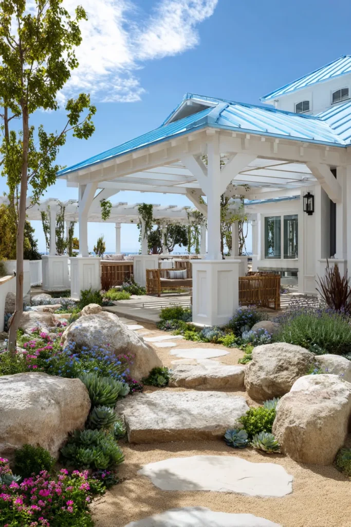 Here the pergola shines with white framing and a vibrant blue metal roof, standing out against the coastal garden around it. Soft-colored flowers and succulents add a breezy charm.