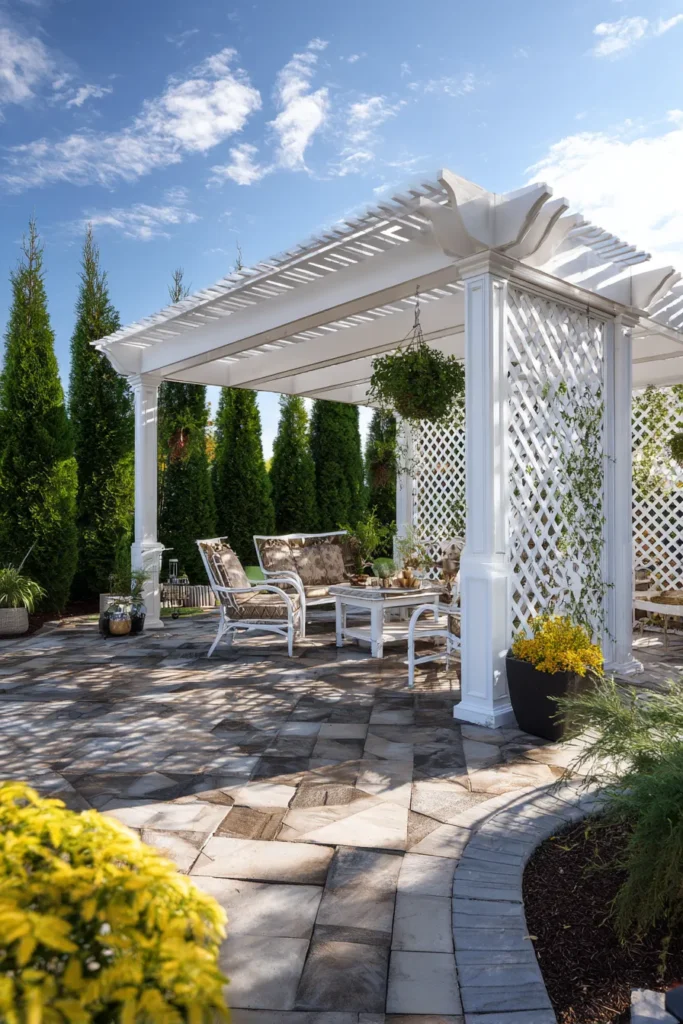This pergola combines crisp white beams with lattice panels on the sides for added privacy. Hanging plants and classic outdoor furniture make the space welcoming and timeless.