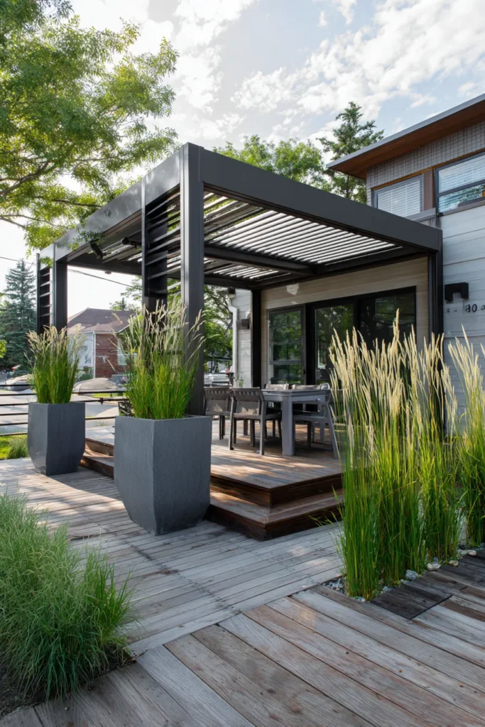 This pergola features a slim black frame with adjustable louvers on top that can tilt for shade or sun. The modern look is softened with planters and a clean wooden deck.
