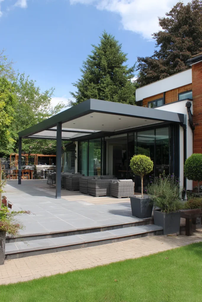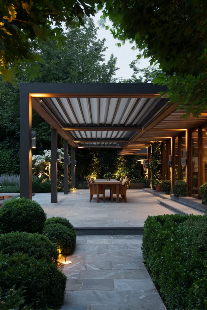 This pergola features a modern frame with a clean-lined structure and a retractable roof that creates the perfect mix of shade and sunlight. Surrounded by lush greenery and lit with warm ambient lighting, the dining space beneath feels both sophisticated and inviting.