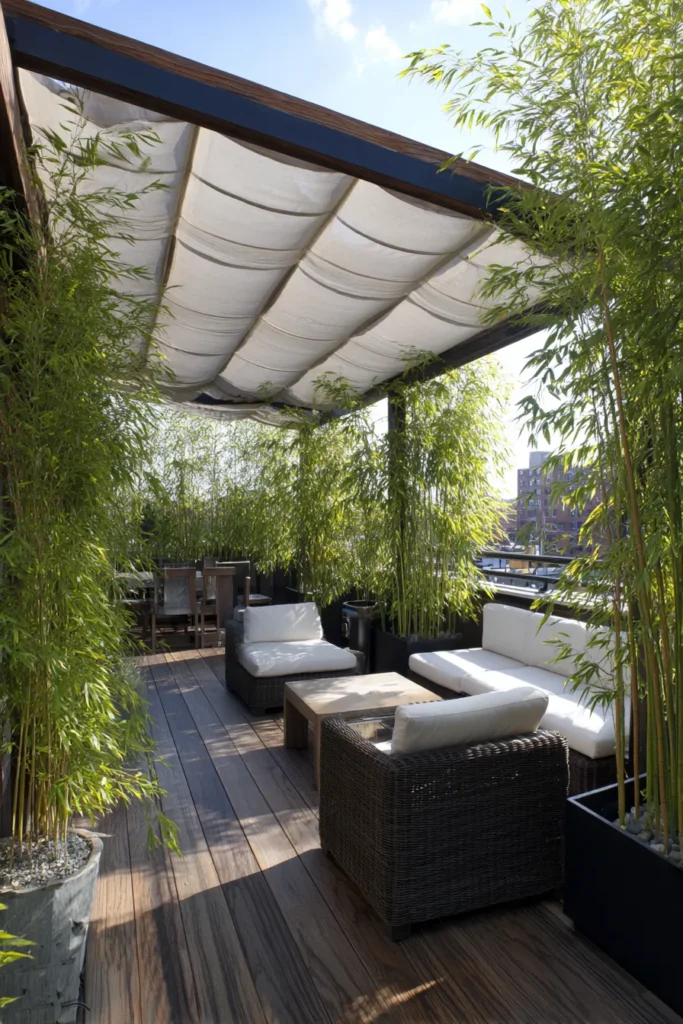 A rooftop setting is transformed with a slim pergola topped by a soft fabric canopy. Bamboo planters add height and privacy, creating a calming retreat high above the city.