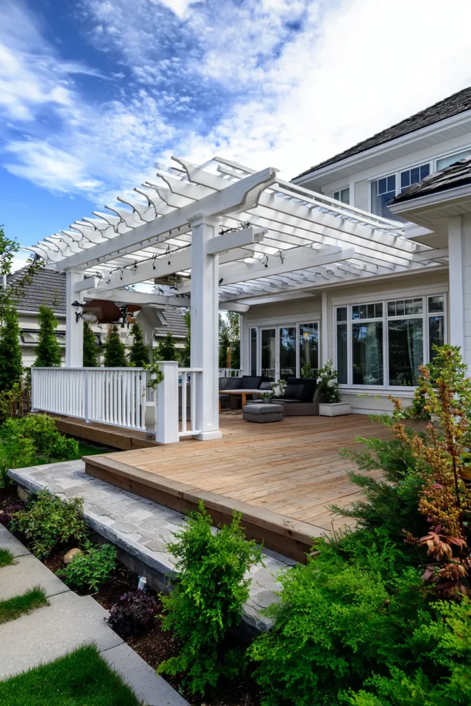 This pergola takes a classic white frame and layers it with open slats that create striped shadows across the deck. String lights add a playful touch, while greenery climbs up the posts.