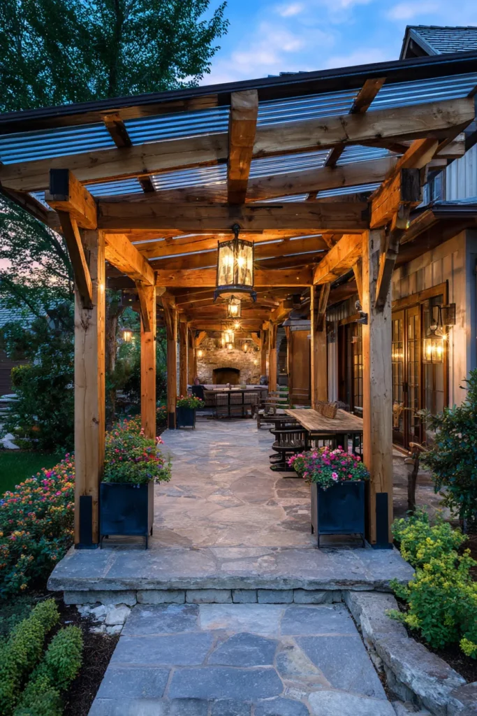 This pergola combines chunky wooden beams with a corrugated metal roof, creating a farmhouse-inspired look. Hanging lanterns and stone flooring finish the space with warmth and charm.