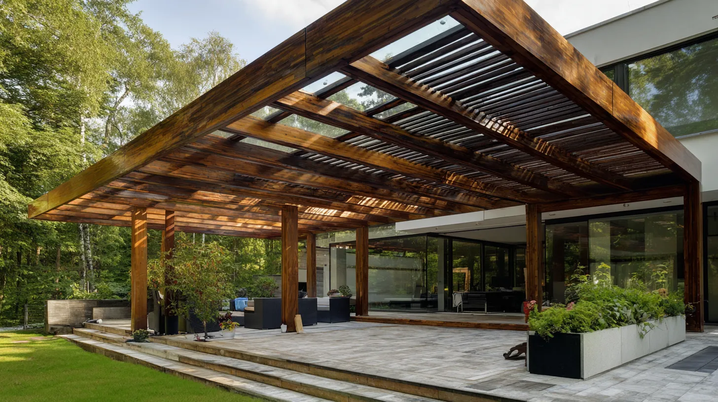 This pergola is designed with sleek black framing and a roof of transparent panels, accented with built-in lighting. The long dining table below becomes the star of the outdoor space, perfect for gatherings.