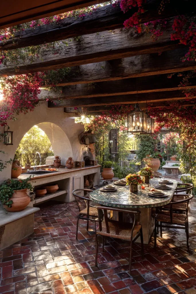 A pergola of heavy beams wears cascades of bougainvillea in rosy bloom. An arched outdoor kitchen runs along one side with terracotta pots and a farmhouse sink. Hand laid bricks shine underfoot. A tiled oval table waits for family style meals. Iron lanterns add a golden glow.