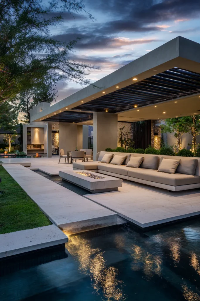 Clean lines set the stage with a wide concrete pergola and a smooth stone terrace that skims the water. A long low sofa stretches beside a sleek fire feature. Recessed lights sparkle at dusk. The palette reads soft sand and charcoal with sculpted greenery and a mirrored pool for calm reflections.