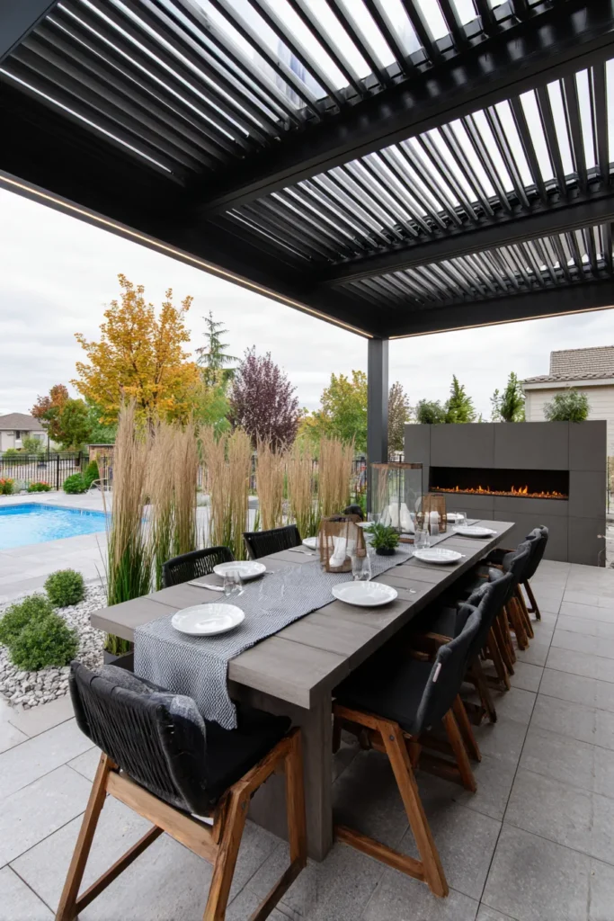 A bold charcoal pergola with adjustable louvers cools a generous dining table. Tall ornamental grasses create privacy and movement. Large format pavers keep things tidy. A ribbon fireplace warms the scene while simple lanterns and black woven chairs lean chic.