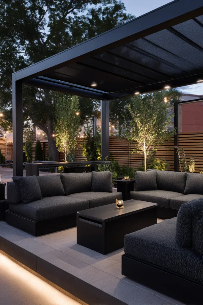 A slim metal frame holds a shaded canopy over deep charcoal sofas. Warm garden uplights wash over trees and slatted fencing for a soft glow. Low tables keep the look tailored while hidden step lighting sketches the edges of the patio.