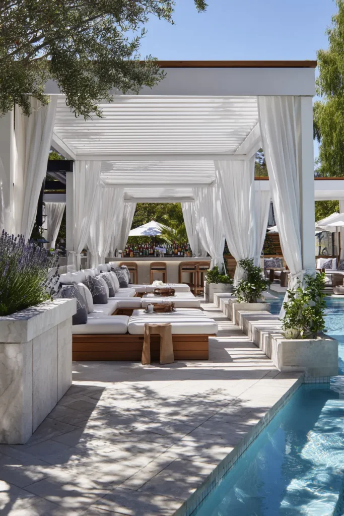 Crisp white pergolas line the water with breezy curtains and built in daybeds. Marble planters hold glossy greenery. A bar waits at the far end for iced cocktails. Sunlight stripes the deck through the slats for that vacation moment.