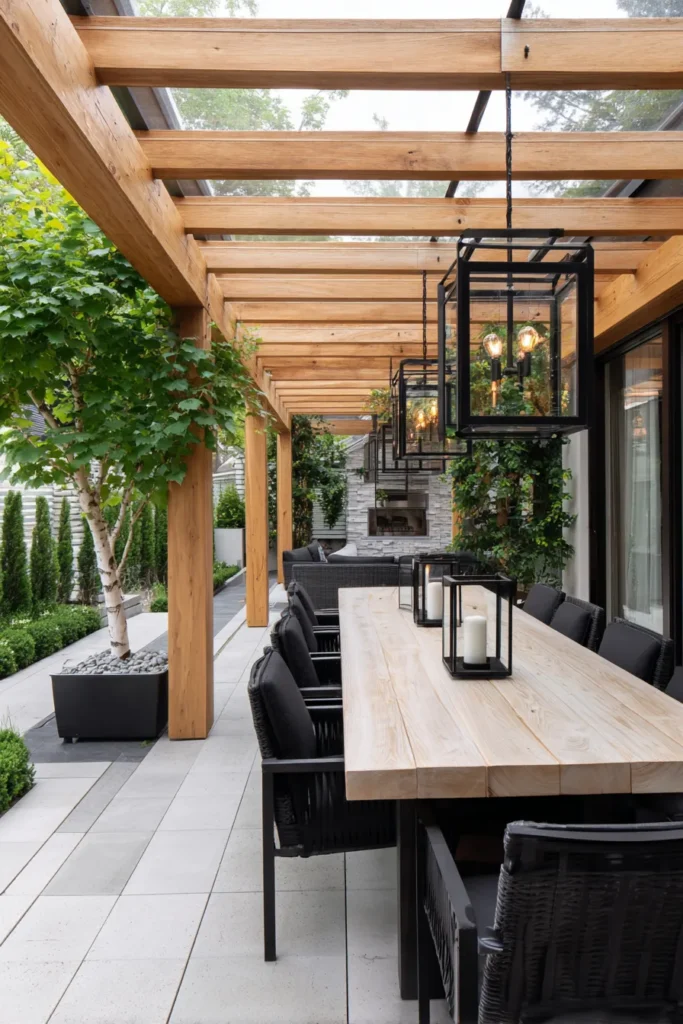 Honey toned beams march along a narrow terrace with a clear roof that filters gentle light. A chunky wood table anchors black woven chairs. Oversized box lanterns hang in a row. Greenery climbs the posts and planters add softness under the birch.