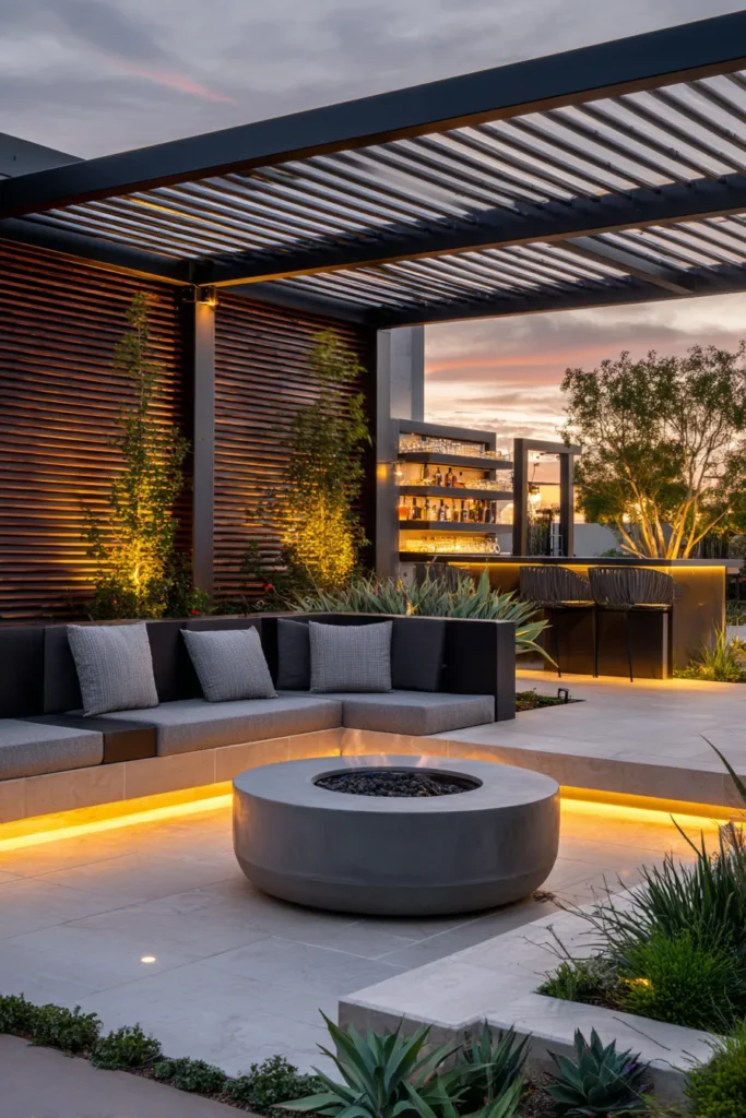 A graphite pergola floats above a built in sectional with layered gray cushions. A round concrete fire bowl glows at center. Warm strip lighting tucks under the seating and along steps. Slatted walls and sculptural plants finish the modern scene.