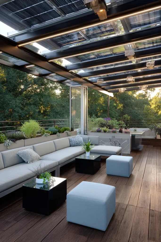 A sleek frame carries glass panels that double as shade and solar smarts. Low sectional seating wraps the perimeter with glossy cube tables. Raised planters brim with herbs and succulents. Smooth wood decking adds warmth and texture.