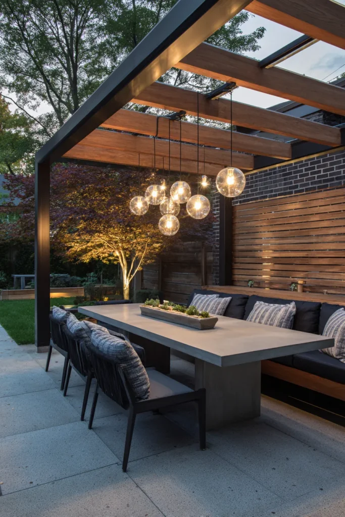 A black and wood pergola shelters a tailored banquette and a concrete dining table. Clear globe pendants sparkle overhead. Slatted fencing and a maple tree add privacy and a gentle glow at twilight. The layout fits a crowd without feeling cramped.