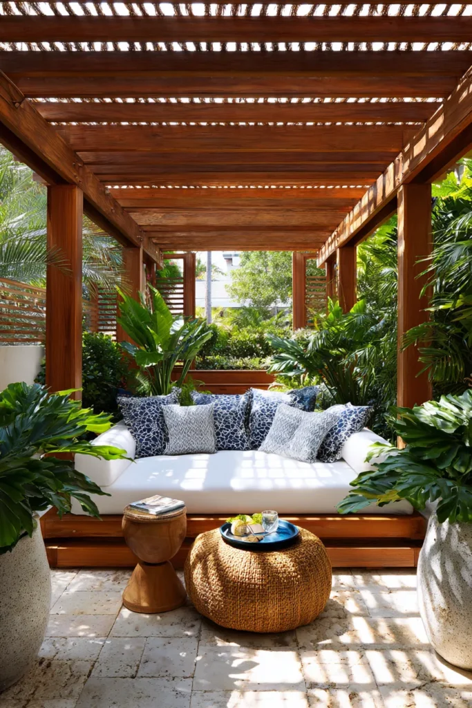 Rich cedar beams frame a lounge wrapped in leafy plants. A plush white daybed piles on blue patterned pillows. Slatted screens filter sunshine into a soft grid across travertine pavers. Natural stools and a woven ottoman keep the mood breezy.
