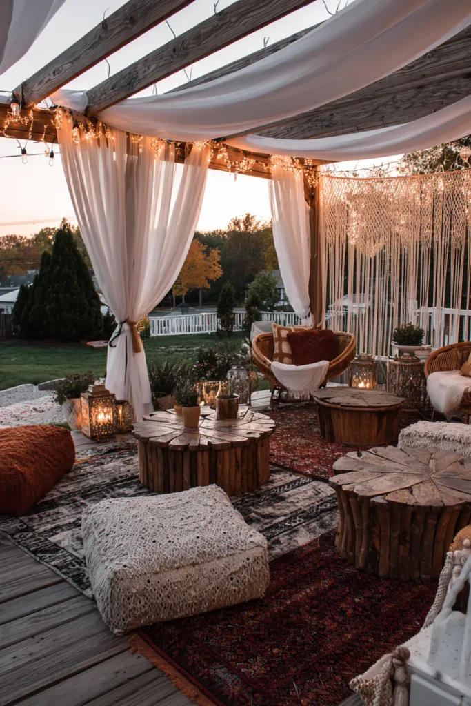Weathered beams carry airy white drapes and a sprinkle of twinkle lights. Macramé hangs as a soft backdrop. Layered vintage rugs warm the deck. Chunky spool tables and wicker chairs circle lanterns that flicker at dusk. Plush knitted poufs invite floor lounging with tea and little nibbles.