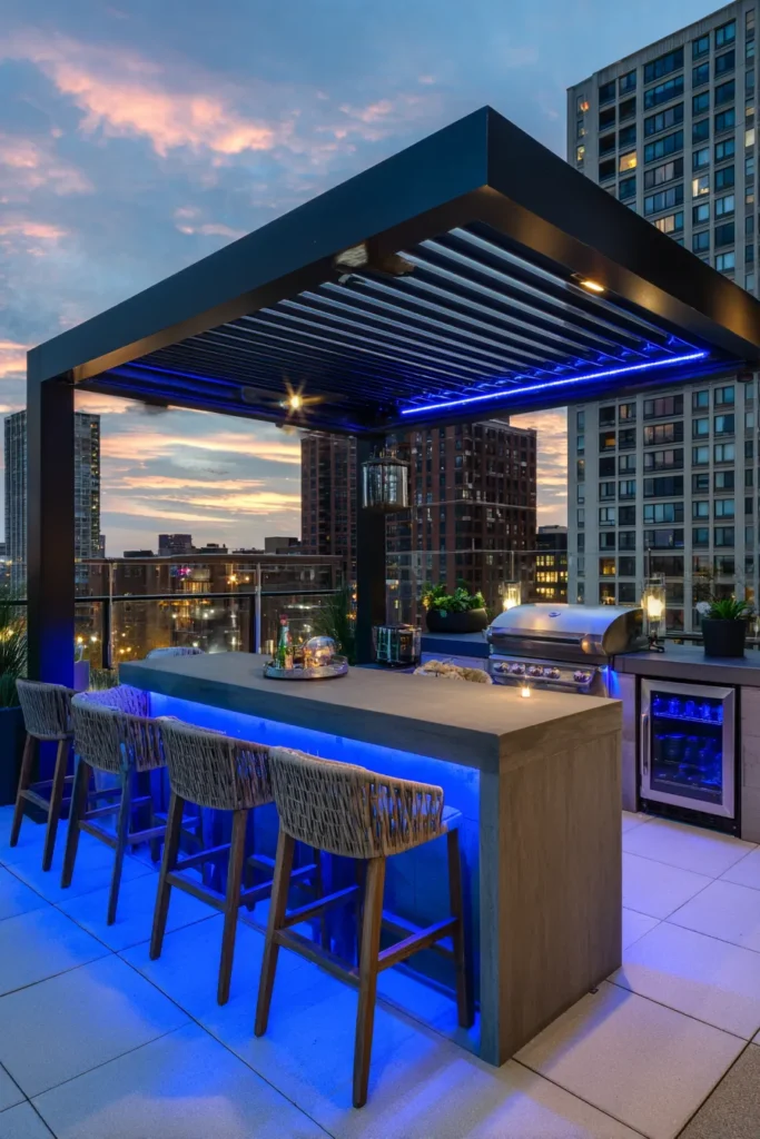 A sharp black pergola crowns a rooftop kitchen with rattan stools and a concrete bar. Blue accent lighting sets a fun after dark mood. City towers shimmer beyond the glass rail. Built in grill and fridge keep entertaining easy.