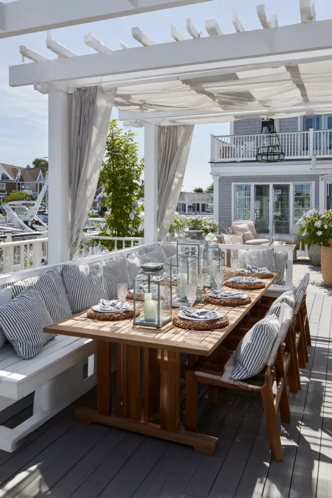 A crisp white pergola frames a built in banquette wrapped in soft striped cushions. Flowing curtains tuck at the posts for shade and privacy. A teak table runs the length of the seating with woven chargers and clear lanterns set in a neat row. Grey decking keeps the palette calm while potted hydrangeas and marina views bring that fresh coastal mood.