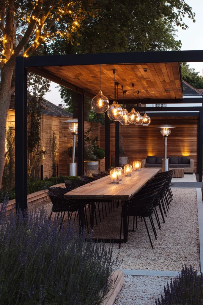 A graphite frame outlines a wood clad canopy. Globe pendants float above a long timber table. Black woven chairs line up for a full house. Gravel and tidy planting beds keep the look crisp. Warm accent lighting makes every dish look special.