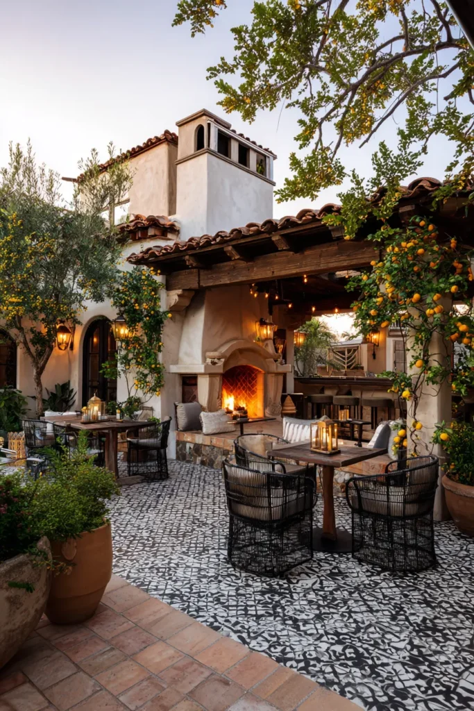 Stucco walls and a clay tile roof create a sheltered nook. A sculpted fireplace anchors the scene with a generous mantel. Patterned pavers mix with rustic stone. String lights and brass lanterns glow softly. Black woven chairs and wood tables invite long chats.