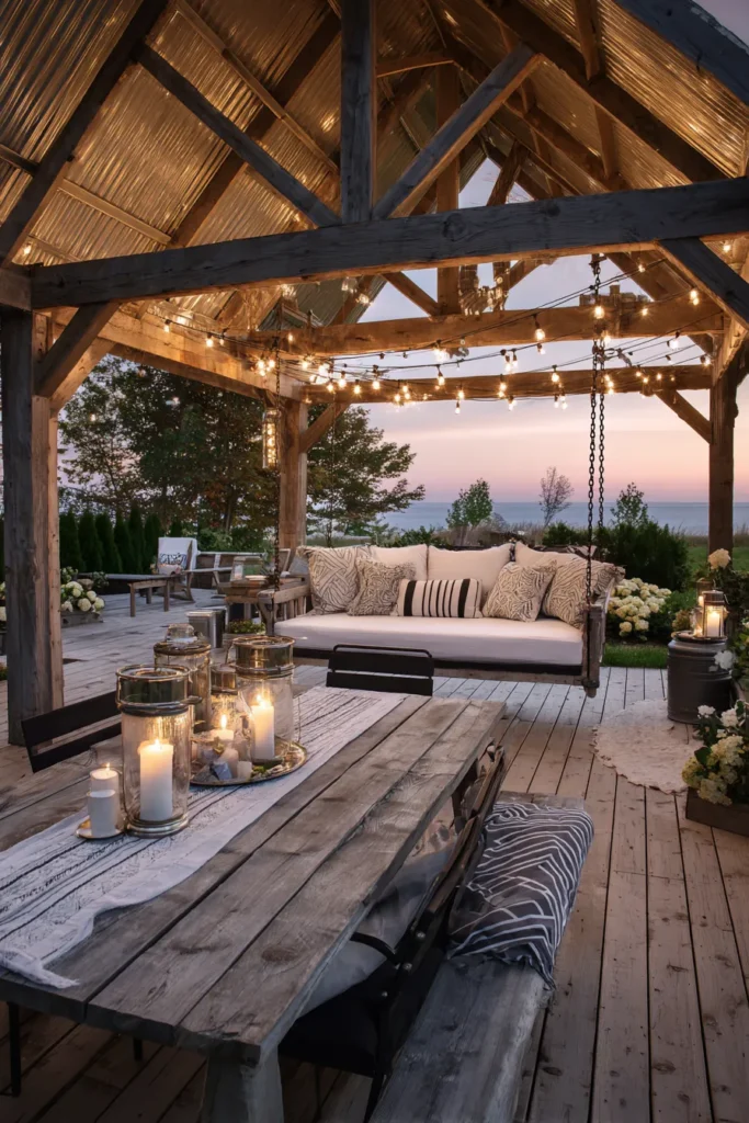 Grand timber trusses hold a corrugated roof that sings with rain. Café lights zigzag over a weathered dining table. A hanging daybed swings sweetly in the corner. Lanterns and candles sparkle across the boards. Hydrangeas and lake views complete the story.
