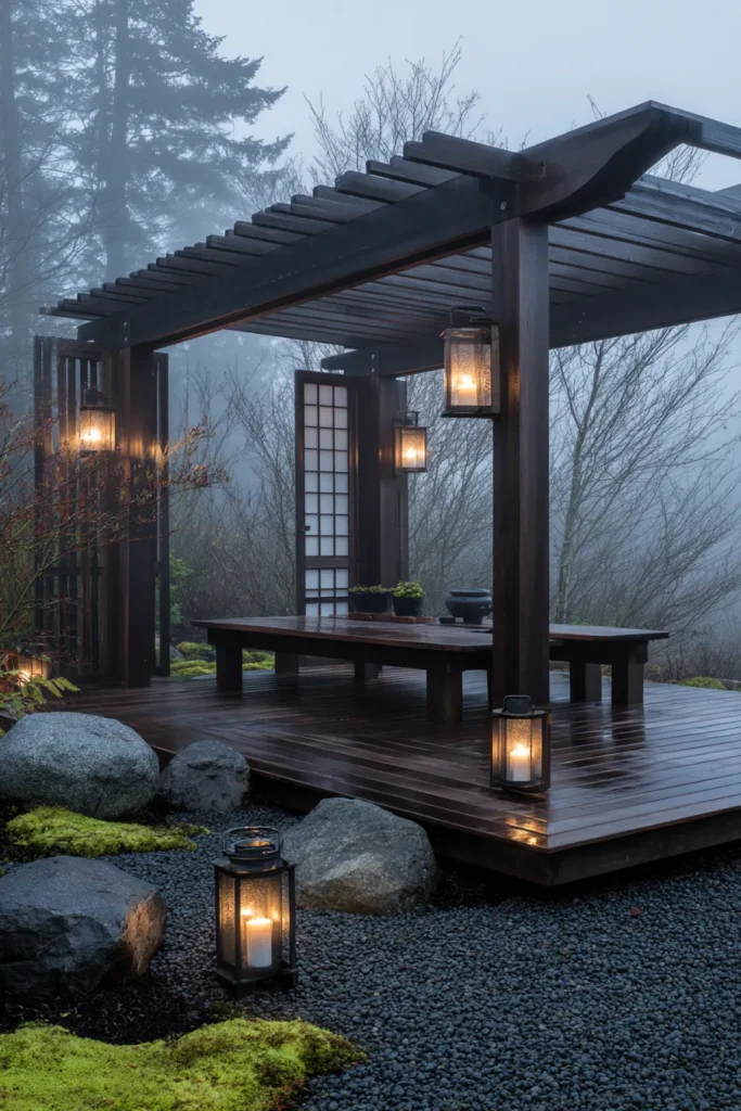 Dark stained wood frames a simple platform with a built in bench. Shoji inspired screens filter the view. Lanterns glow against misty trees. River stones and moss soften the edges. The architecture stays quiet and balanced.