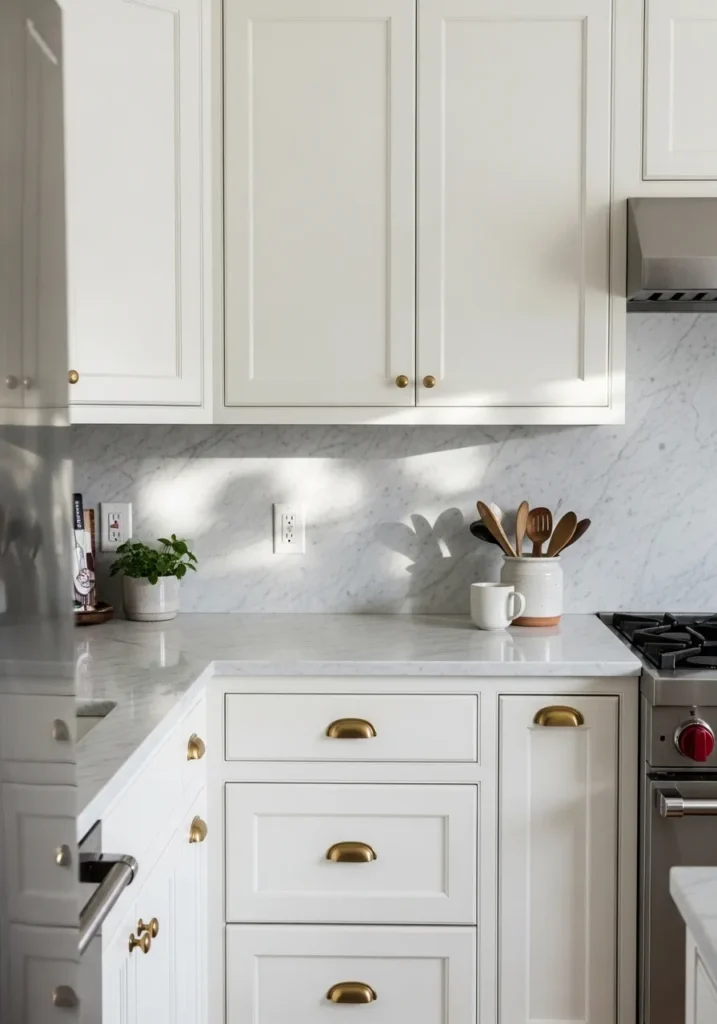 This cabinet color reads very close to Benjamin Moore White Dove. It’s a soft, creamy white that doesn’t feel stark or cold. You can see it in the cabinet doors and how it sits easily next to the marble backsplash and warm brass pulls. It’s the kind of white that feels lived-in right away.