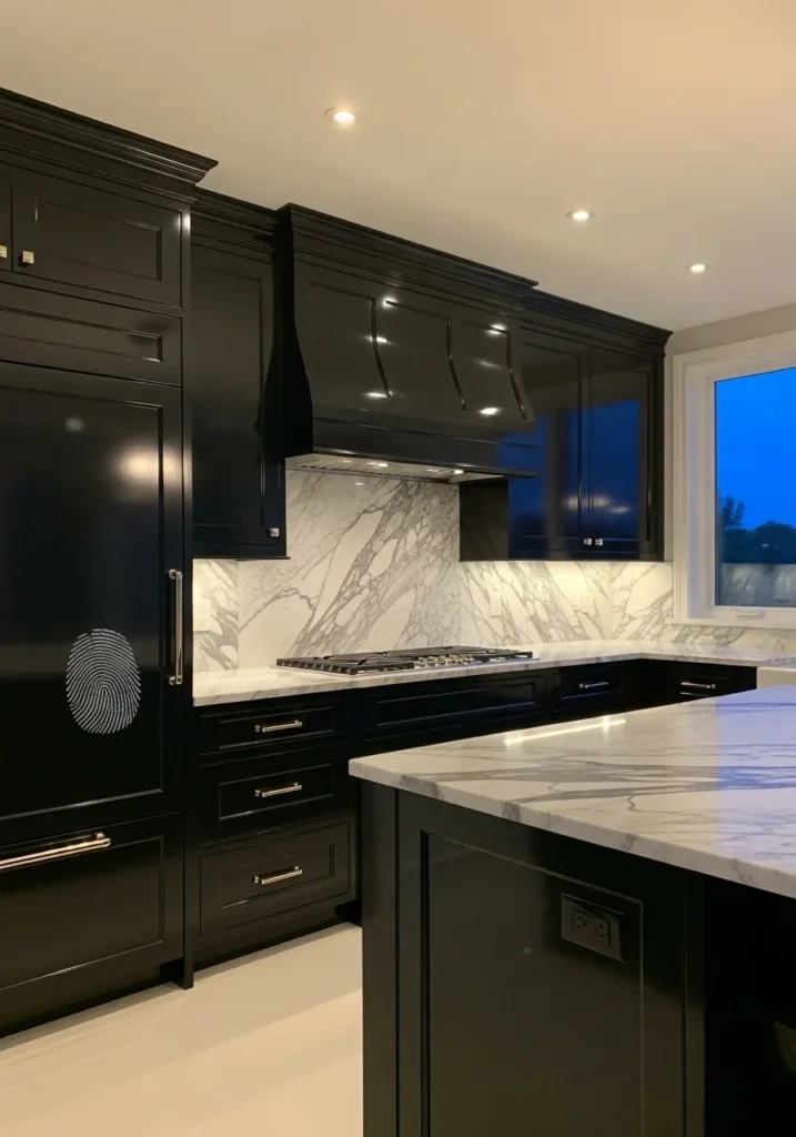 This looks very close to Benjamin Moore Black Satin. It’s a soft black rather than a flat, inky one, with just enough depth to show a bit of light on the surface. On cabinets, it feels bold but still usable, especially next to the marble backsplash.