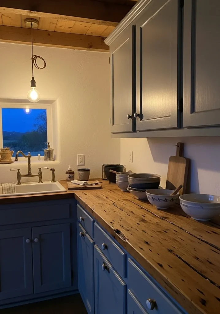This looks very close to Benjamin Moore Van Deusen Blue. It’s a deeper blue with a slightly softened edge, not too bright and not too dark. On cabinets, it feels steady and a bit classic, especially next to the worn wood countertop.