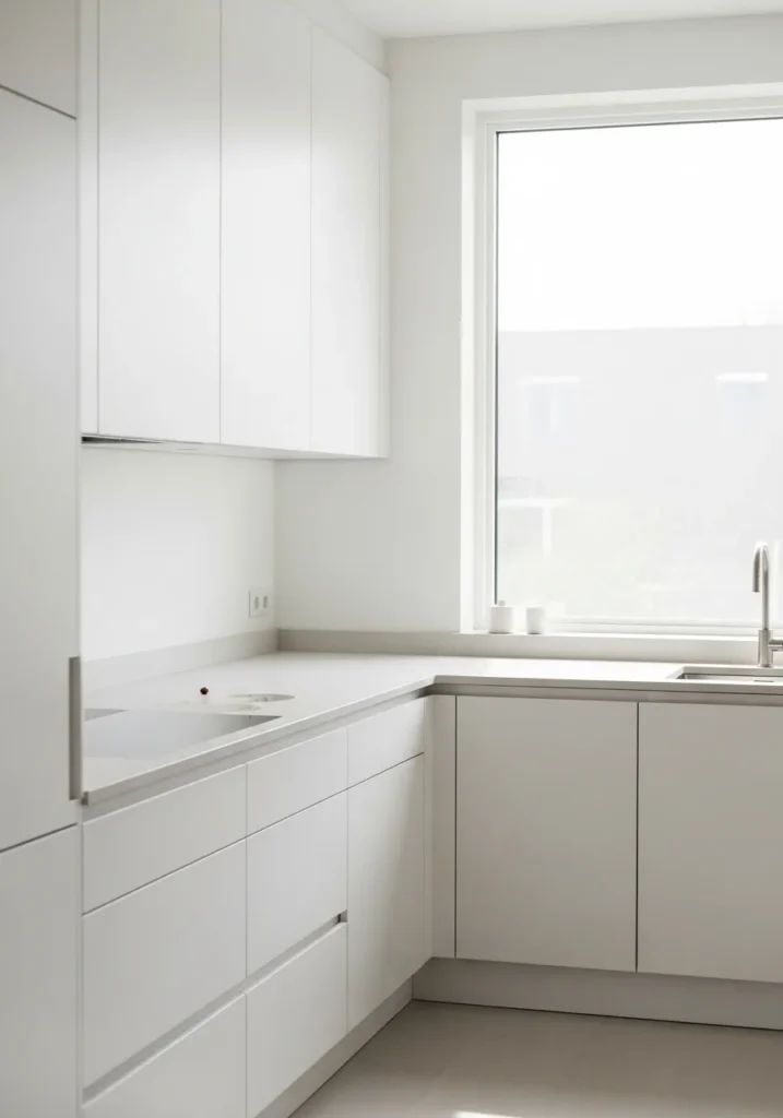 There’s only a hint of undertone here, which keeps it looking bright even in softer light. It works well in modern kitchens where you want that simple, almost seamless look. Just keep in mind, next to warmer finishes it can read a bit sharp, so it pairs best with other clean whites and cool neutrals.