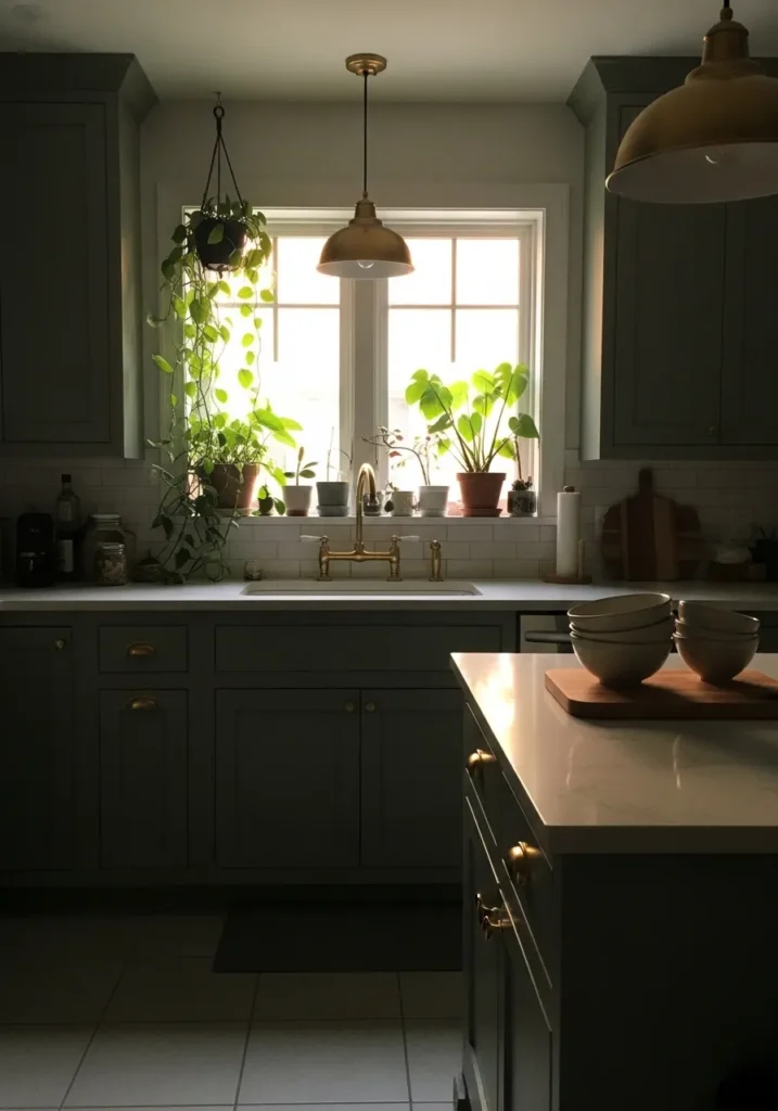 There’s a gentle warmth underneath that comes through more under indoor lighting, which can make it read slightly beige at times. It works well in smaller kitchens like this where you want some color but not too much contrast. I’d pair it with warm metals or wood tones to keep it consistent, since cooler finishes can make it shift a bit flat.