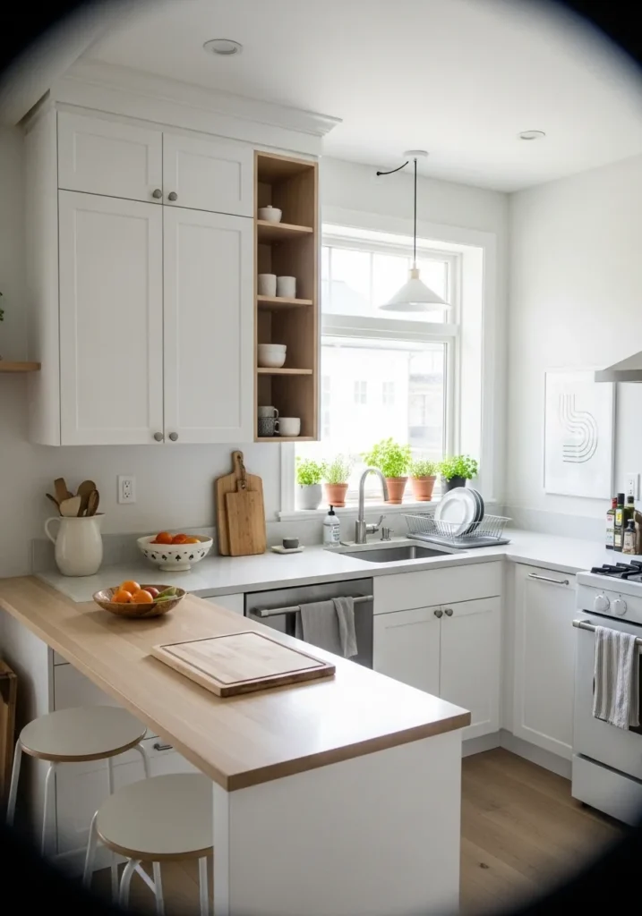 This looks very close to Benjamin Moore White Dove. It’s a soft white with a gentle warmth, not stark or bright. On cabinets, it feels easy and familiar, especially next to the light countertop and simple open shelving.