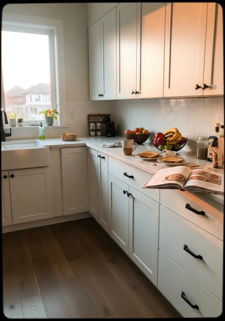There’s a soft warmth underneath that shows up more near the window light, which keeps it from feeling flat. It works well in kitchens with natural light and pairs nicely with darker floors or black handles like these. I’d be a bit careful using it with very cool gray finishes since the warmth might stand out more than you want.