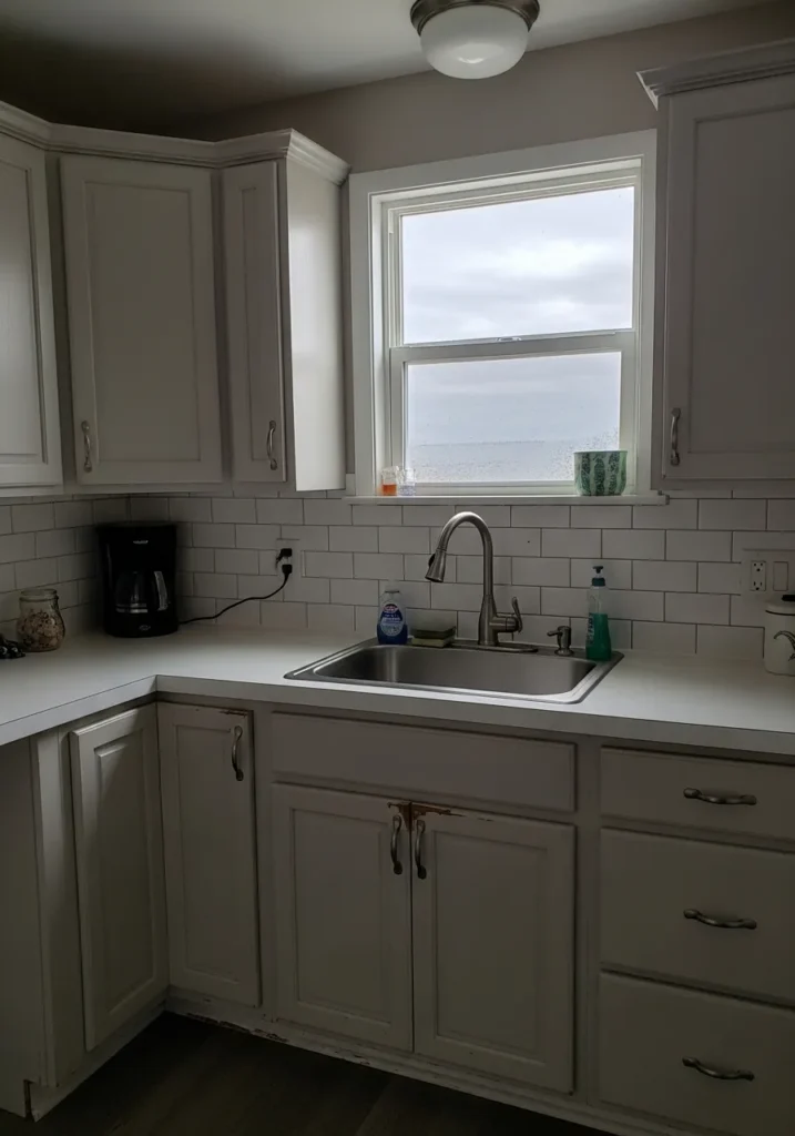 There’s a gentle gray undertone that shows more in lower light, which can make the cabinets read slightly deeper than expected. It works well in kitchens with a mix of light sources and pairs nicely with brushed nickel or stainless finishes like the faucet. If your space is already a bit dim, just know it may lean more gray than white.