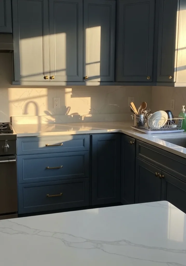 This looks very close to Benjamin Moore Gentleman’s Gray. It’s a deep blue with a slight teal lean, not quite navy and not quite green. On cabinets, it reads bold but still controlled, especially against the darker counters and simple hardware .