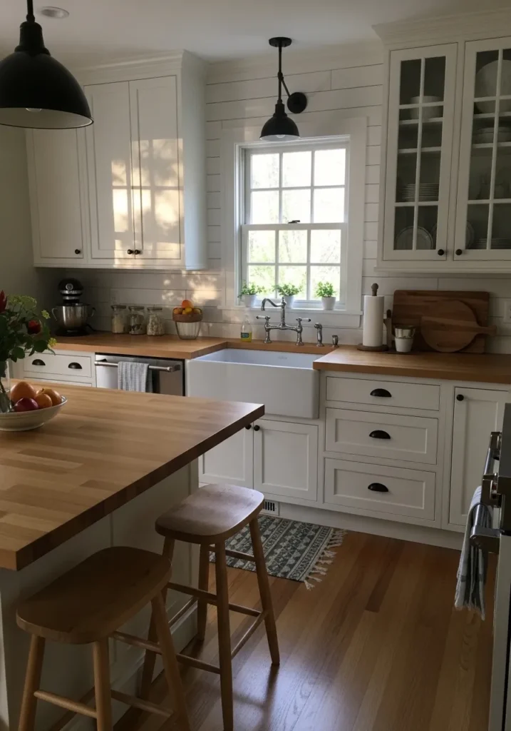 This looks closest to Benjamin Moore Swiss Coffee. It’s a soft off white with a creamy base, not too bright and not too yellow. You can see it on the cabinets next to the wood countertops, where it feels easy and relaxed rather than crisp.