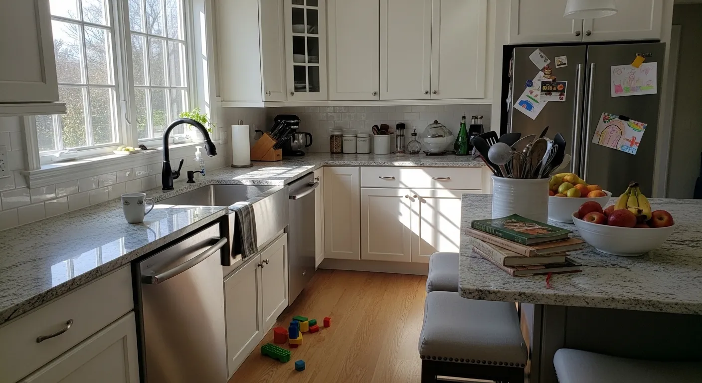 There’s a slight warmth in it that keeps it from feeling too harsh, which helps when you pair it with lighter counters and brushed metal hardware. It works best in kitchens with good lighting so it doesn’t feel too heavy. If the space is darker, it can start to read almost solid black with very little variation.